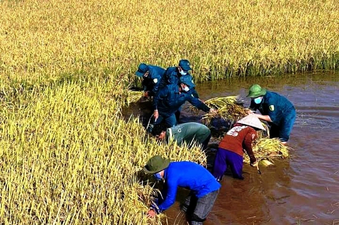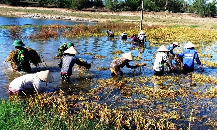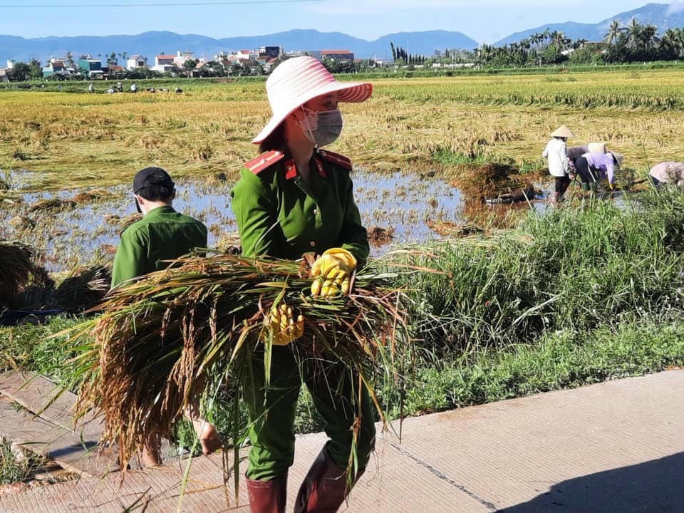 Quảng Ngãi: Công an, Quân đội cùng hội, đoàn thể giúp dân gặt lúa bị ngập sau bão