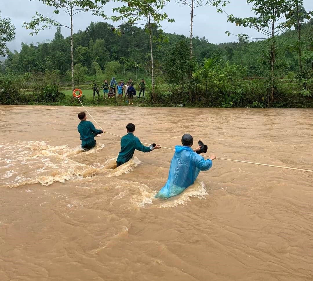 Do mưa lớn nên nước sông chảy xiết, các chiến sĩ phải căng dây thừng rồi dìu từng người vượt sông. Sau nhiều giờ nỗ lực, 18 người dân thôn Nước Lầy đã được hỗ trợ đến nơi an toàn.
