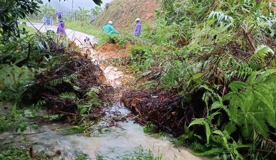 Tương tự, tại một số huyện miền núi Ba Tơ, Sơn Tây, tỉnh Quảng Ngãi, mưa lớn cũng đã gây sạt lở nhiều nơi, nhiều tuyến đường bị chia cắt. Hiện chính quyền địa phương đã chỉ đạo cho lực lượng chức năng tiếp tục theo dõi, để kịp thời triển khai các biện pháp di dời dân tại các khu vực nguy hiểm, đến nơi an toàn. Còn ở địa bàn huyện Sơn Tây, một điểm núi Bảy Màu, xã Sơn Tân đã bị sạt lở khoảng 50m3, khiến đất đá trôi ra đường, gây ách tắc giao thông. Ngay sau khi xảy ra sạt lở, lãnh đạo xã Sơn Tân đã có mặt tại hiện trường chỉ đạo cán bộ xã, đoàn viên, thanh niên cùng với người dân khẩn trương dọn dẹp đất đá, đảm bảo đi lại, sinh hoạt của nhân dân và đảm bảo an toàn giao thông, đồng thời cắm biển báo nguy hiểm tại khu vực xảy ra sạt lở.