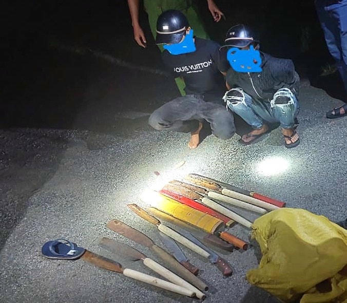 Theo Công an tỉnh Quảng Ngãi, lúc 21h15 ngày 16/9, Tổ công tác đặc biệt Công an tỉnh Quảng Ngãi phối hợp với Công an TP Quảng Ngãi tuần tra trên địa bàn phường Nghĩa Lộ, TP Quảng Ngãi đã phát hiện nhóm thanh niên gồm 6 người đi trên 2 xe gắn máy, mang theo 1 bao tải có biểu hiện nghi vấn. Tổ công tác yêu cầu các đối tượng dừng phương tiện để kiểm tra, phát hiện trong bao tải chứa 8 con dao, 1 cây kiếm và 1 vỏ kiếm, 3 cây đao và đã tạm giữ N.Đ.V. và T.M.T.; 4 đối tượng còn lại tẩu thoát.