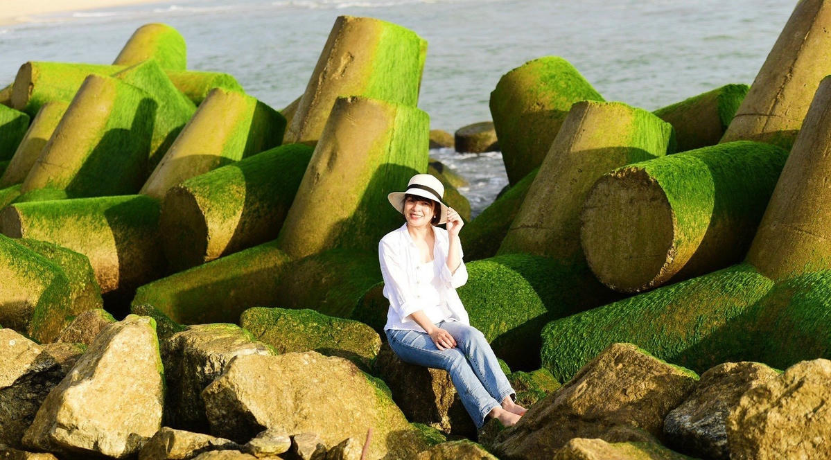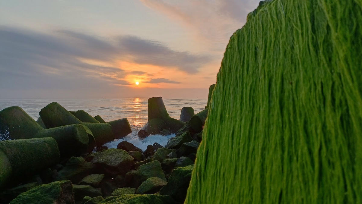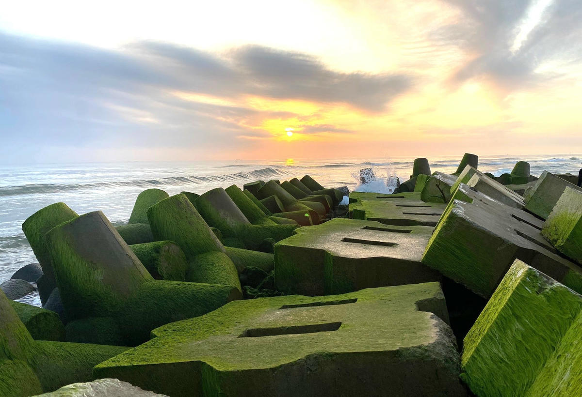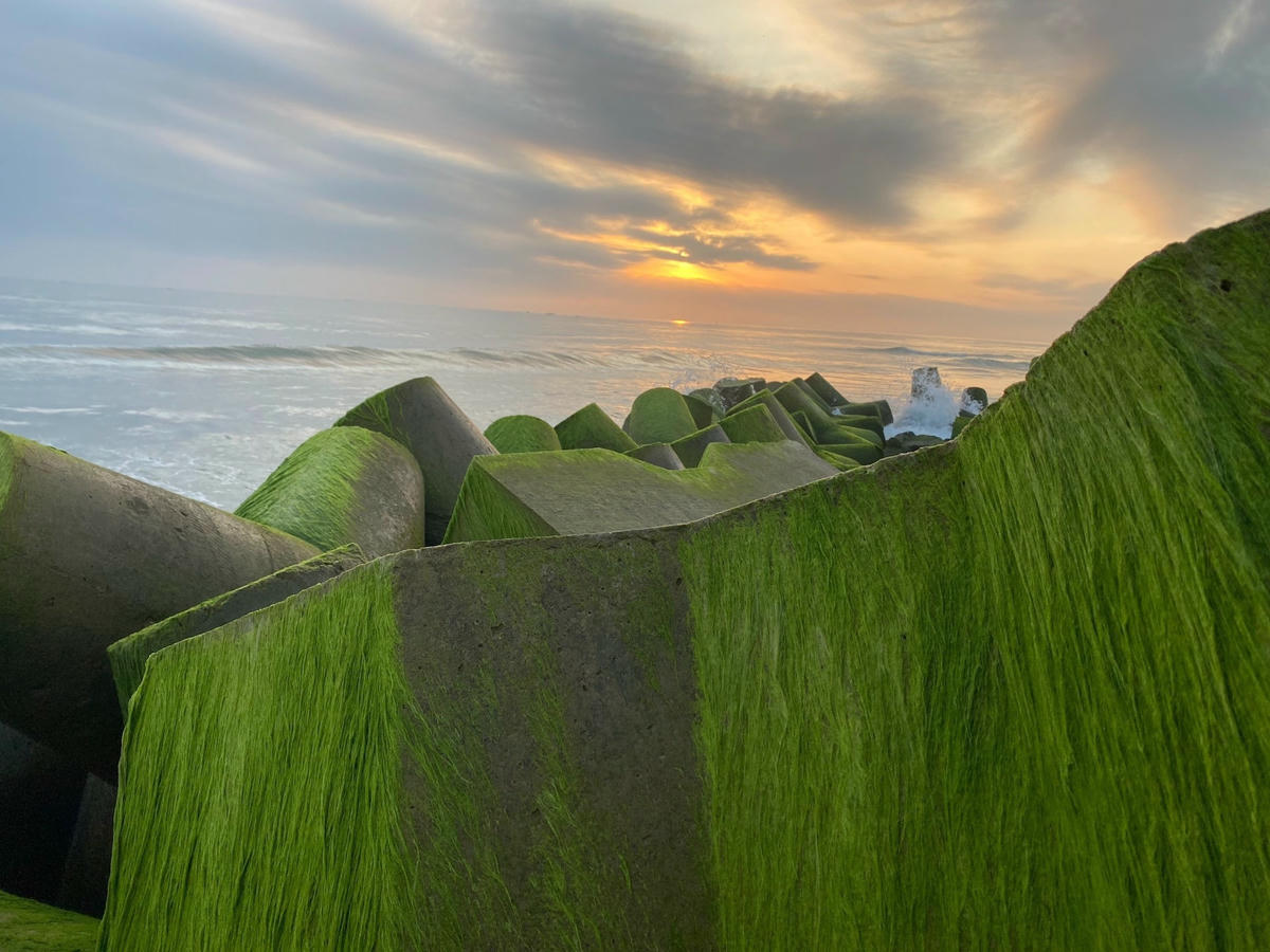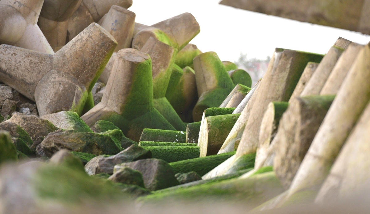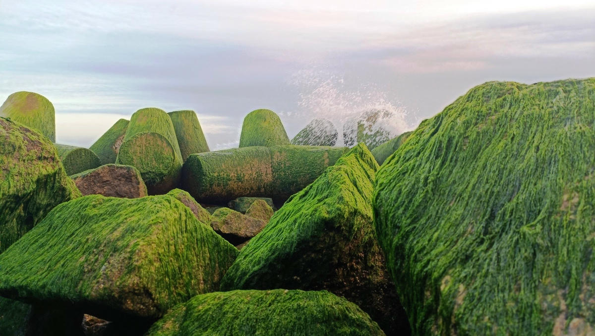 Tại bờ kè chống sạt lở bờ bắc Cửa Đại, thuộc thôn Khê Tân, xã Tịnh Khê, TP Quảng Ngãi, tỉnh Quảng Ngãi, rêu xanh mọc bám vào các ụ bê tông dài hàng trăm mét, thu hút nhiều người mê mẩn kéo đến chụp ảnh.