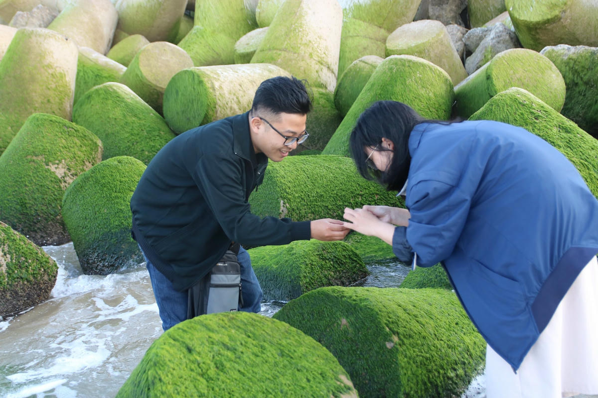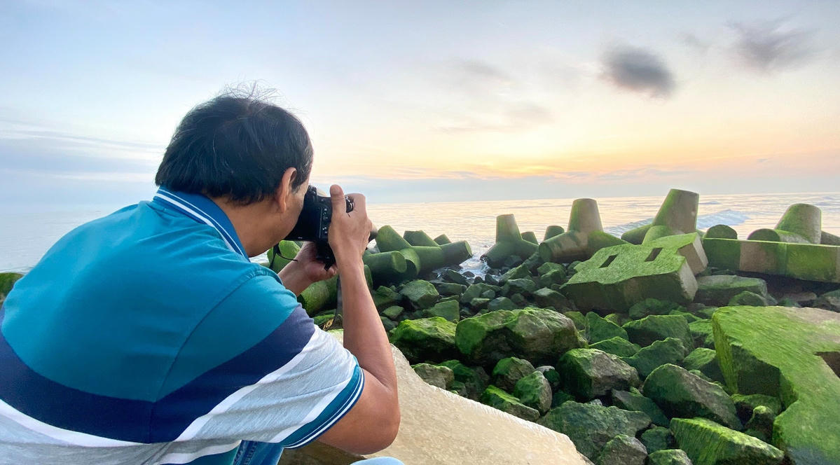 Chị Võ Ánh Nguyệt ở TP Quảng Ngãi cho biết: “Rêu xanh ở đây bám vào các mảng bê tông, hòn đá nhìn rất đẹp nên tôi đã tranh thủ xuống đây đón bình minh và chụp một số ảnh lưu niệm”.