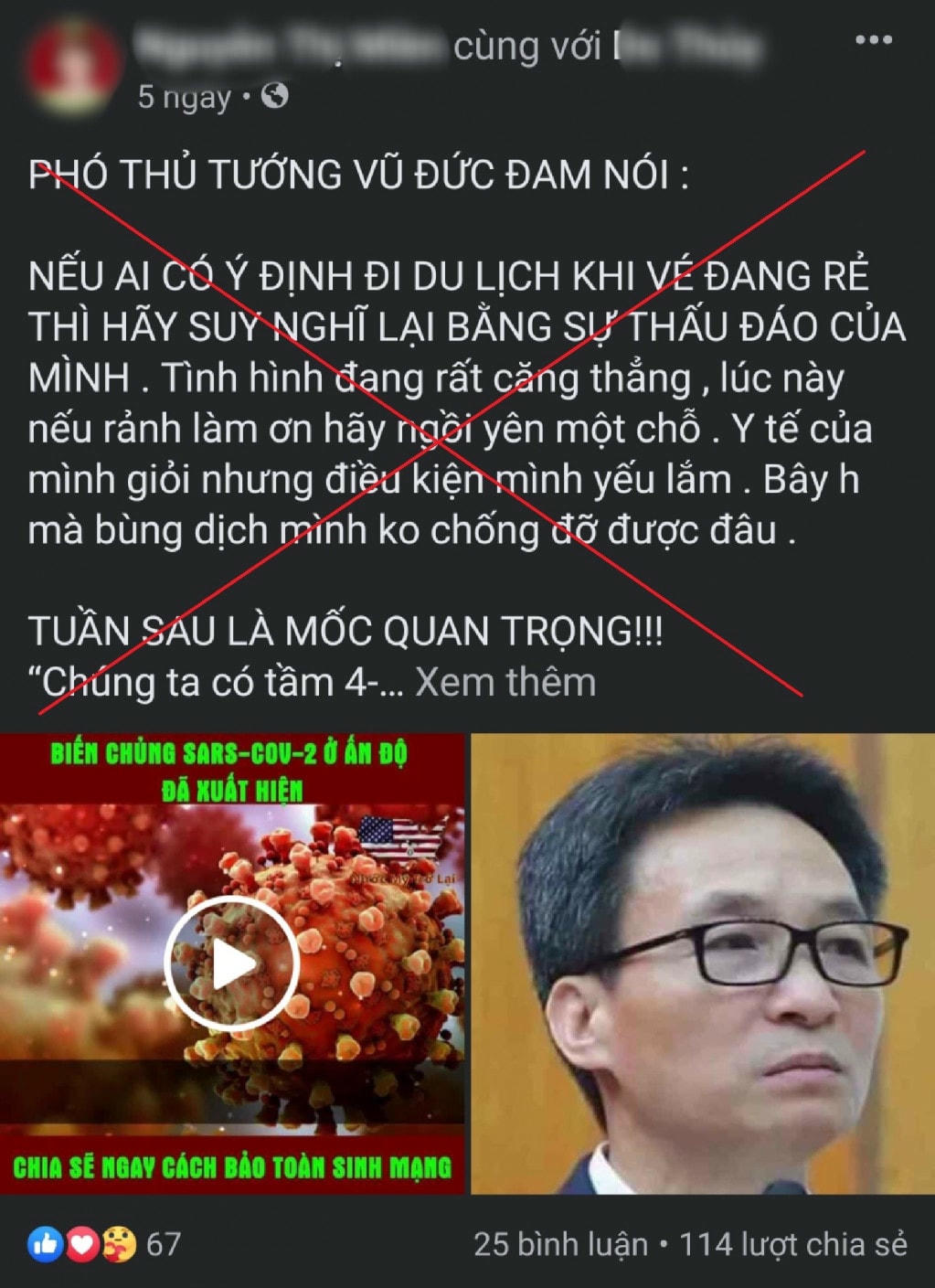 Phát hiện vụ việc, Công an tỉnh Quảng Ninh tiến hành mời bà M. lên làm việc. Tại cơ quan Công an, bà M. đã thừa nhận hành vi đăng tải thông tin trên là sai sự thật, ảnh hưởng đến công tác chỉ đạo phòng, chống dịch bệnh của Đảng, Nhà nước nói chung và hình ảnh của đồng chí Phó Thủ tướng Vũ Đức Đam nói riêng.