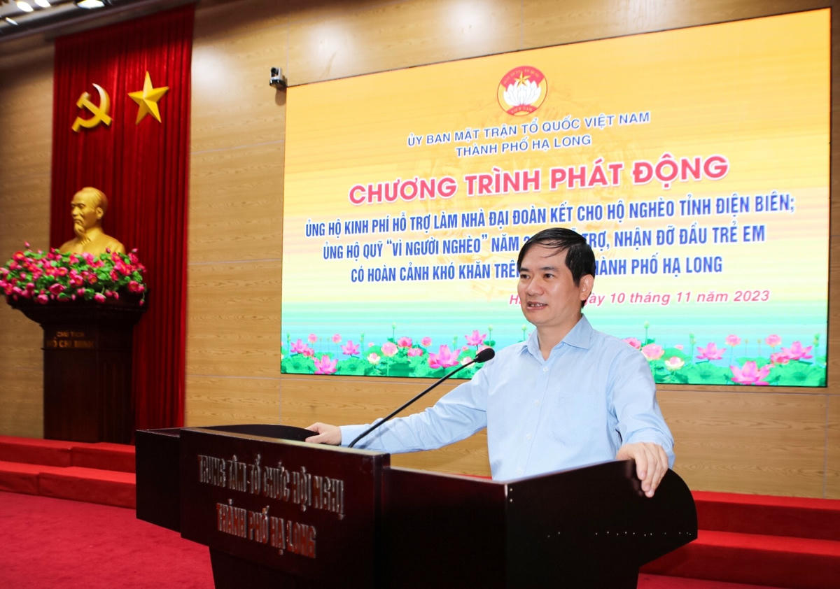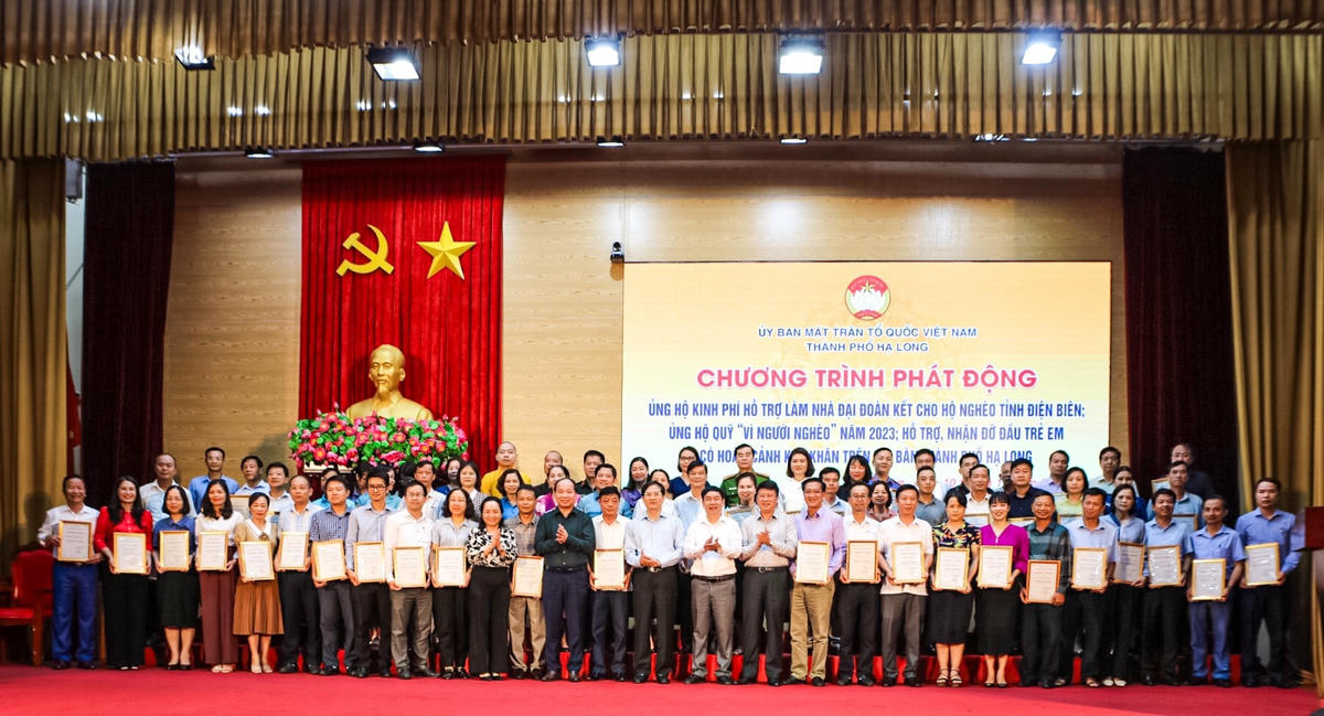 Ngày 10/11, Ủy ban MTTQ Việt Nam TP Hạ Long đã tổ chức phát động ủng hộ kinh phí hỗ trợ làm nhà Đại đoàn kết cho hộ nghèo tỉnh Điện Biên; ủng hộ quỹ “Vì người nghèo” năm 2023 và hỗ trợ, nhận đỡ đầu 120 trẻ em có hoàn cảnh khó khăn trên địa bàn thành phố.