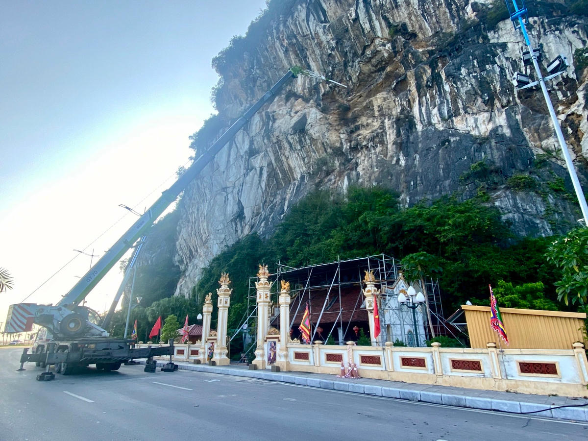 Đơn vị thi công đã lắp đặt giàn giáo, dùng ván phủ phim bao che toàn bộ phía trên mái che bài thơ cổ. Đồng thời, bố trí nhân lực và cần cẩu chuyên dụng có khả năng vươn cao hơn 60m để tiến hành tháo gỡ, đưa tất cả những viên đá mồ côi và đất cát xuống mặt đất. Việc thi công được tiến hành hoàn toàn bằng phương pháp thủ công để không làm ảnh hưởng đến kết cấu của di tích.