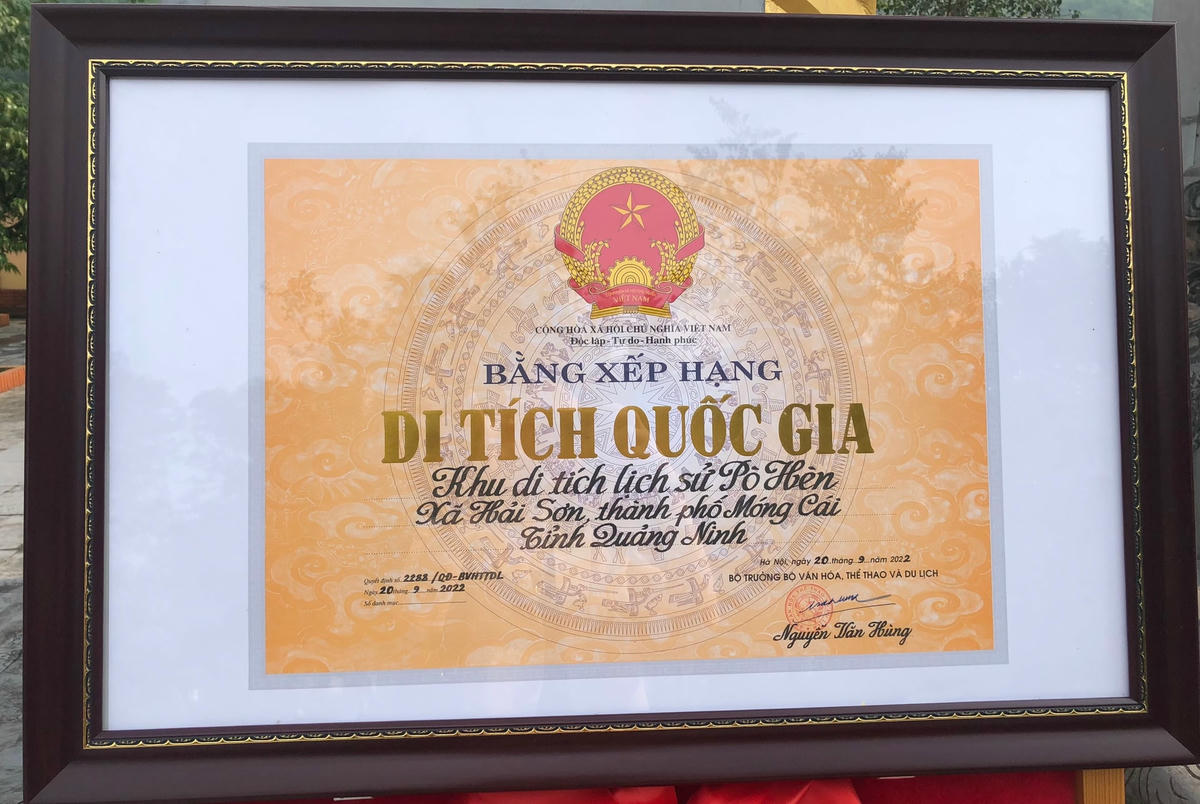 Mới đây, Bộ Văn hóa, Thể thao và Du lịch đã ban hành Quyết định số 2288/QĐ-BVHTTDL ngày 20/9/2022 về việc xếp hạng di tích quốc gia di tích lịch sử Khu Di tích lịch sử Pò Hèn (xã Hải Sơn, TP Móng Cái, Quảng Ninh).