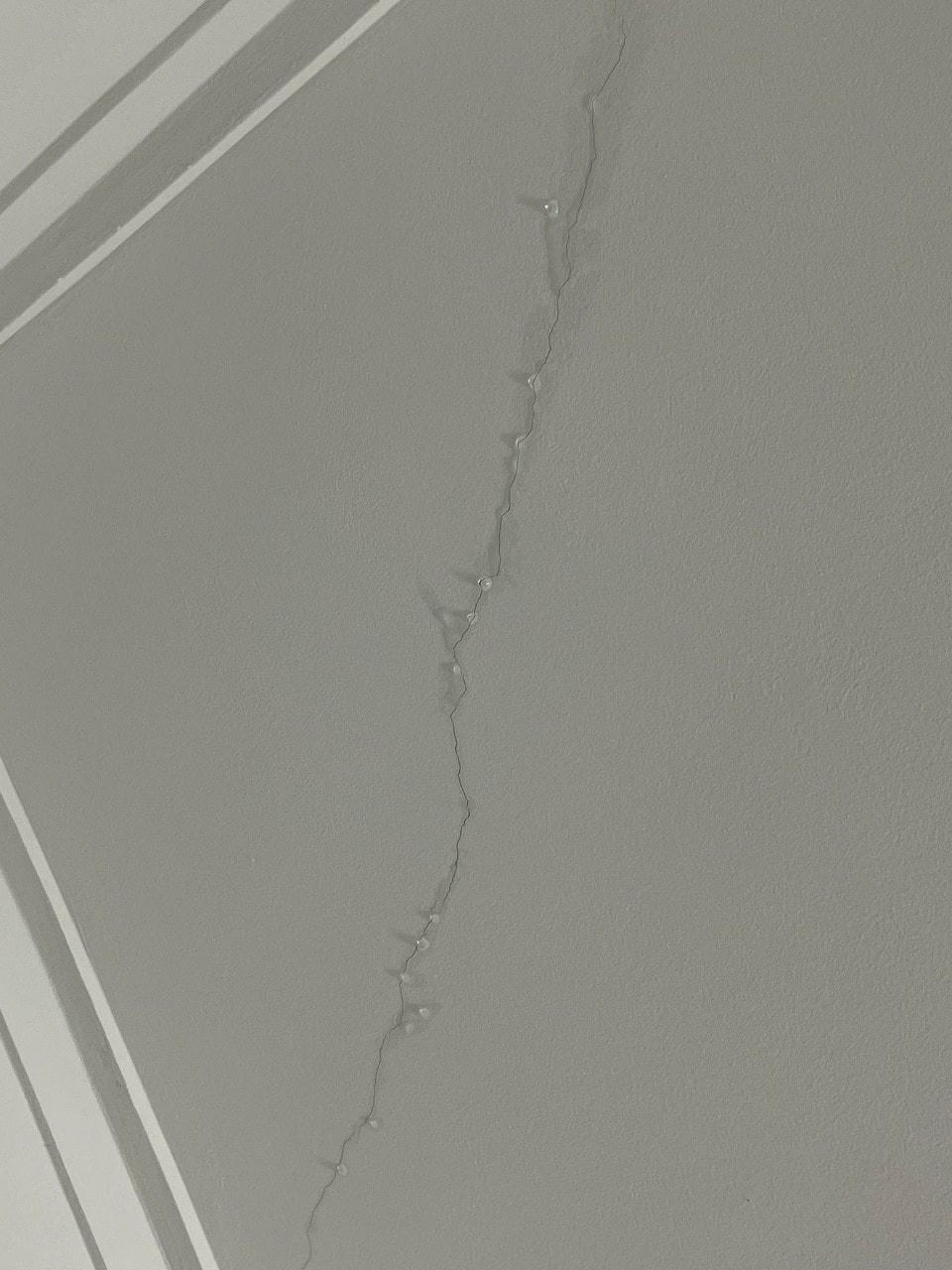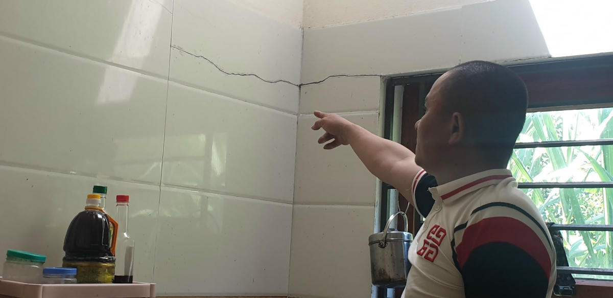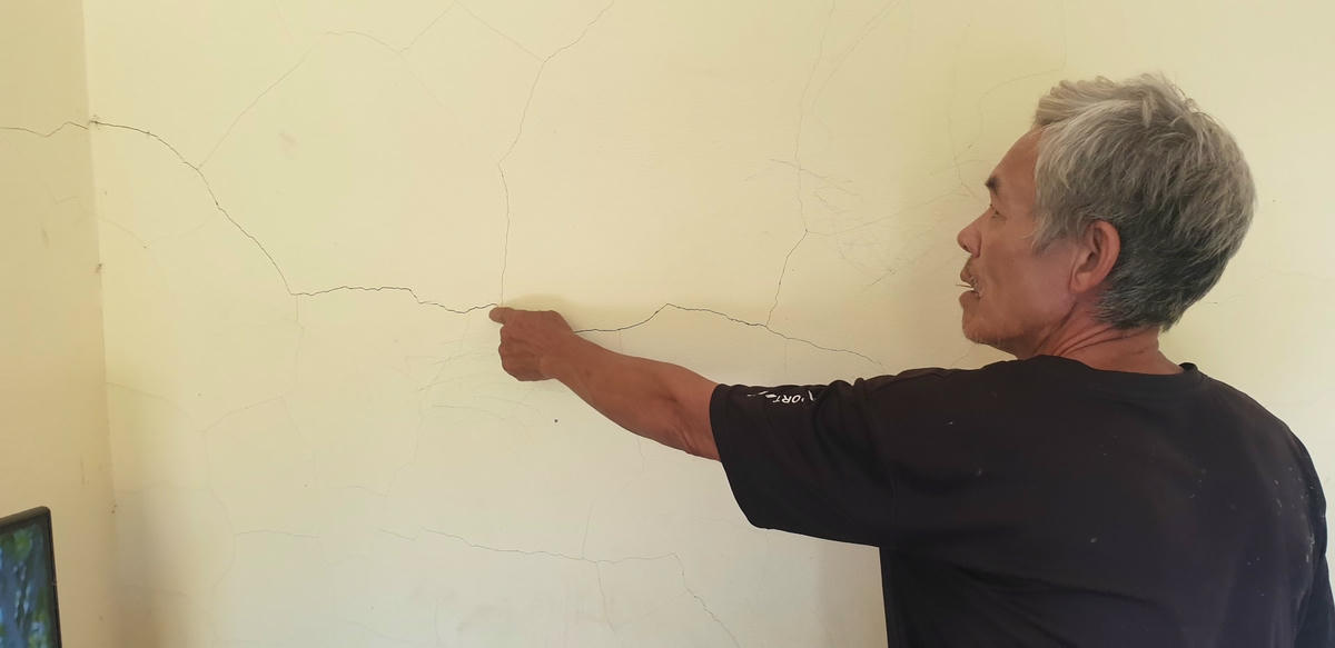 Dẫn PV đi khảo sát quanh căn nhà, anh Minh chỉ những vết nứt chạy ngang, dọc từ trần nhà xuống tường các phòng ngủ. Theo anh Minh, bắt đầu từ mùa mưa năm 2022, nhà anh có hiện tượng dột, đến tháng 3/2023 anh phải tiến hành gia cố một lớp bê tông trên mái để chống dột, nhưng nếu mưa lớn nước vẫn thấm qua các vết rạn nứt, nhỏ giọt vào nhà. Vết nứt mới nhất xuất hiện hồi tháng 4/2023, rộng gần 1cm, xẻ vỡ hàng gạch men ốp tường ở gian bếp.