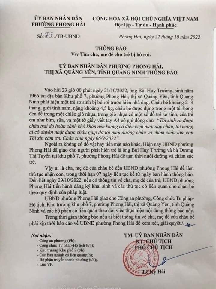 Trước đó, vào 23h ngày 21/10, ông Bùi Huy Tường (56 tuổi, ở tại khu 7, phường Phong Hải, TX Quảng Yên, Quảng Ninh) phát hiện một bé nam khoảng 2 tháng tuổi bị bỏ rơi trước hiên nhà. Cháu bé được để trong một túi bóng đen, đặt trong giỏ nhựa cùng một số đồ cho trẻ sơ sinh.