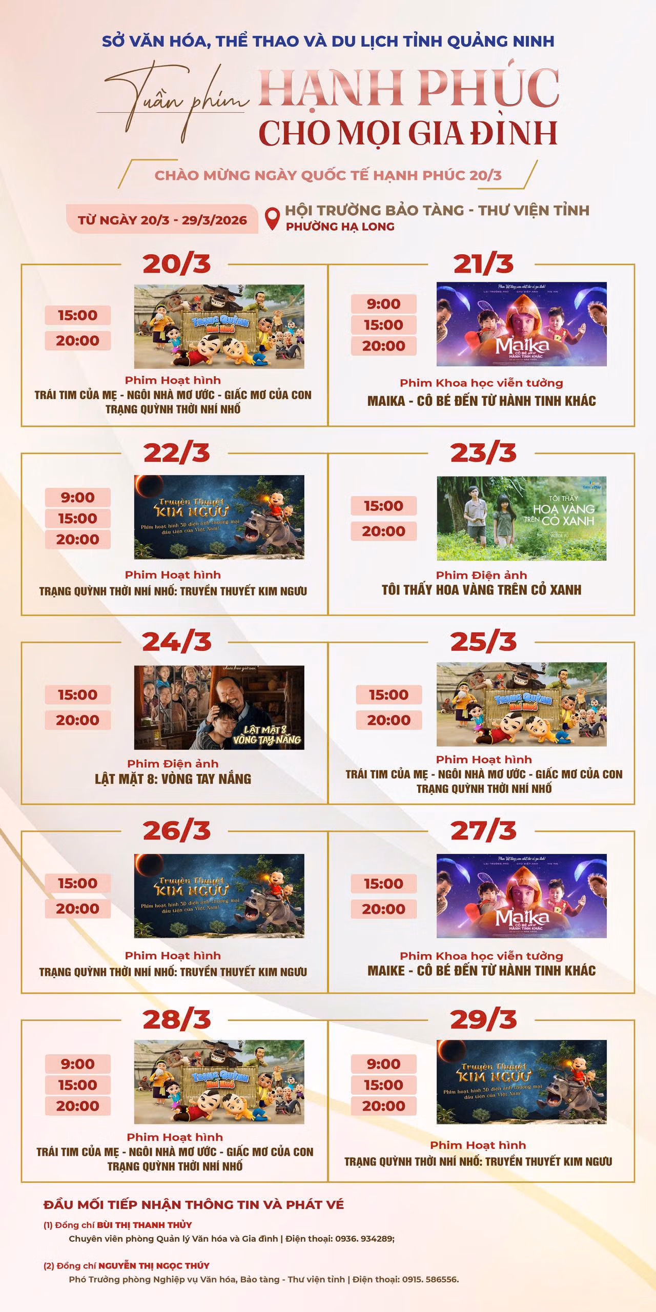 Tuần phim "Hạnh phúc cho mọi gia đình" diễn ra từ ngày 20-29/3, tại Hội trường Bảo tàng - Thư viện tỉnh Quảng Ninh (phường Hạ Long). Từ thứ 2 đến thứ 5 tổ chức 2 suất chiếu mỗi ngày: Chiều 15h - 17h30; Tối 20h - 22h30. Riêng thứ 7 và Chủ nhật tổ chức 3 suất chiếu mỗi ngày: Sáng 9h - 11h30; Chiều 15h - 17h30; Tối 20h - 22h30. Mỗi suất chiếu có quy mô 300 khán giả.