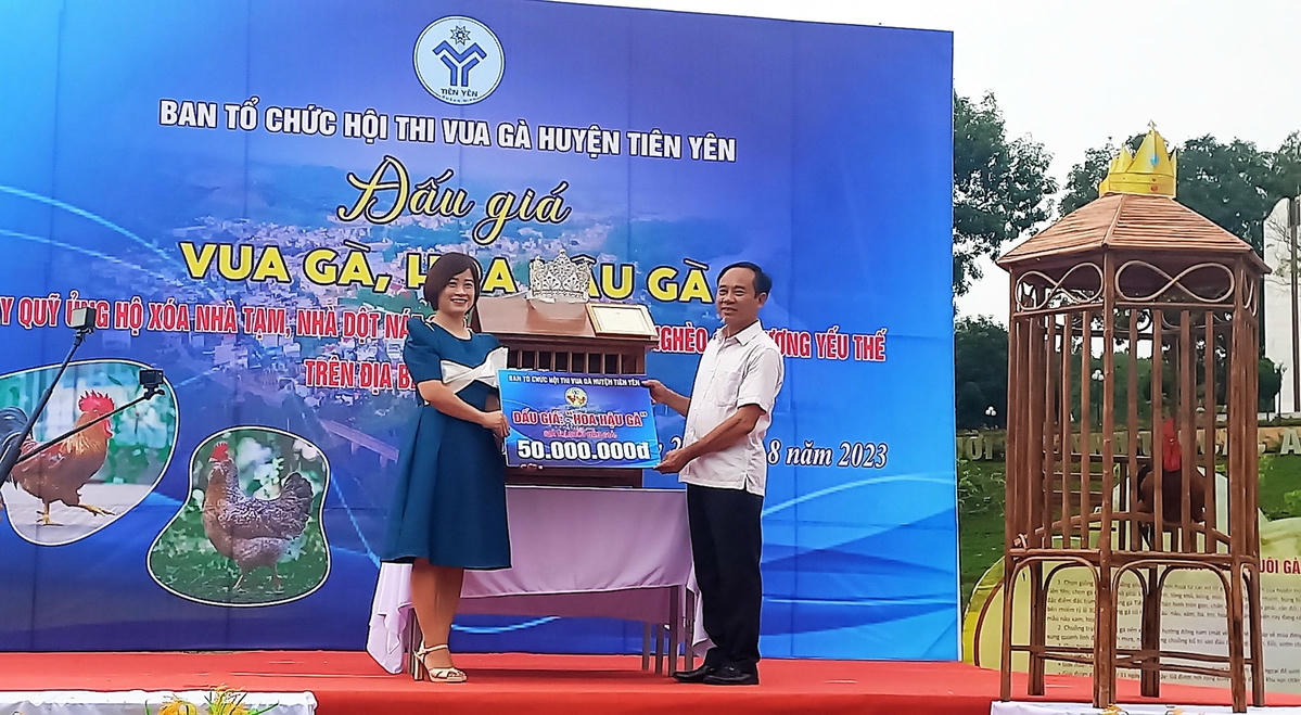Những chú gà đạt danh hiệu cao tại Hội thi Vua gà Tiên Yên 2023 đã đưa ra đấu giá nhằm gây quỹ ủng hộ xóa nhà tạm, nhà dột nát trên địa bàn huyện.