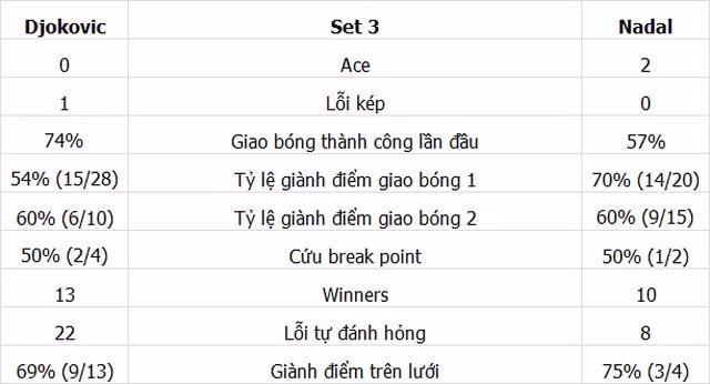 Djokovic liên tục phải bám đuổi Nadal trong game 3, anh để đối thủ có break point sau cú dọc dây ra ngoài. Nadal không tận dụng được cơ hội bẻ game trong pha bóng tiếp theo, anh chủ động tấn công, nhưng cú đánh quyết định lại đánh ra ngoài. Những cú đánh hỏng liên tiếp của Nadal giúp Djokovic bảo vệ game thành công, tay vợt người Serbia vượt lên dẫn 2-1.