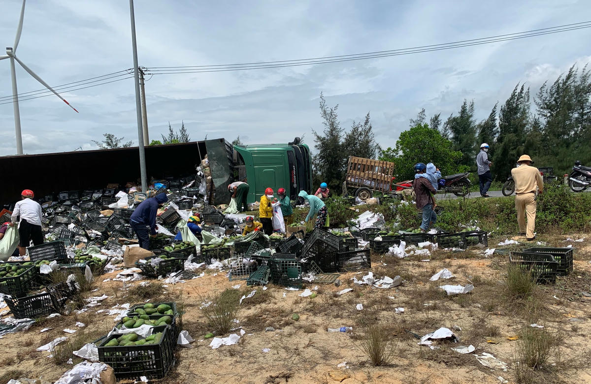 Rơ moóc bị lật, người dân gom nhặt hơn 30 tấn xoài giúp tài xế
