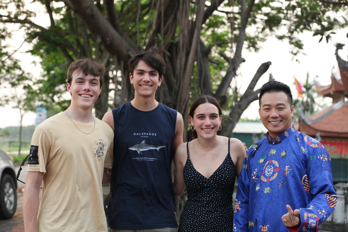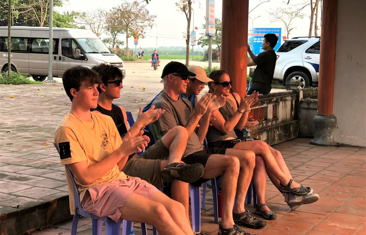 Du khách nước ngoài thích thú thưởng thức biểu diễn rối nước.