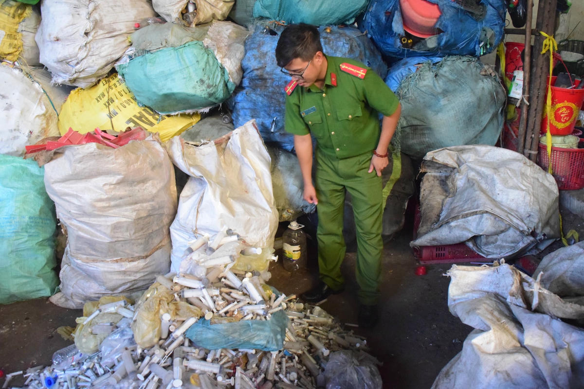 Cảnh sát ập vào một cơ sở thu mua phế liệu và phát hiện 9 bao tải đựng bơm kim tiêm đã qua sử dụng, ống nghiệm dính máu, găng tay... chưa qua phân loại.