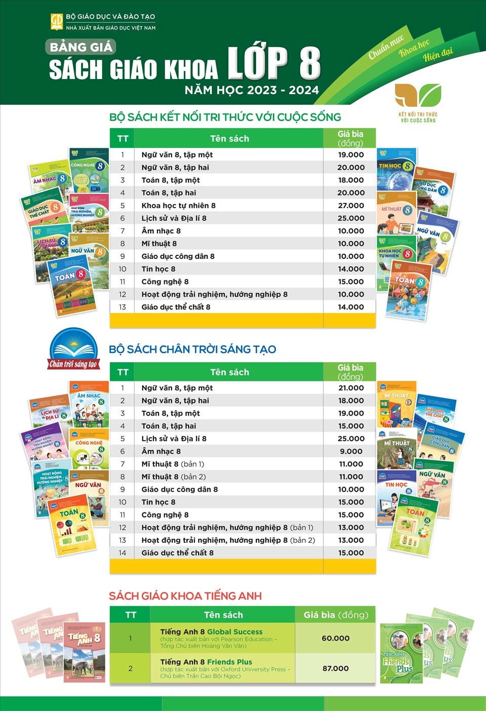 Sách giáo khoa lớp 8, bộ Kết nối tri thức với cuộc sống có giá 212.000 đồng. Bộ Chân trời sáng tạo có giá là 186.000 đồng (chưa bao gồm sách tiếng Anh).