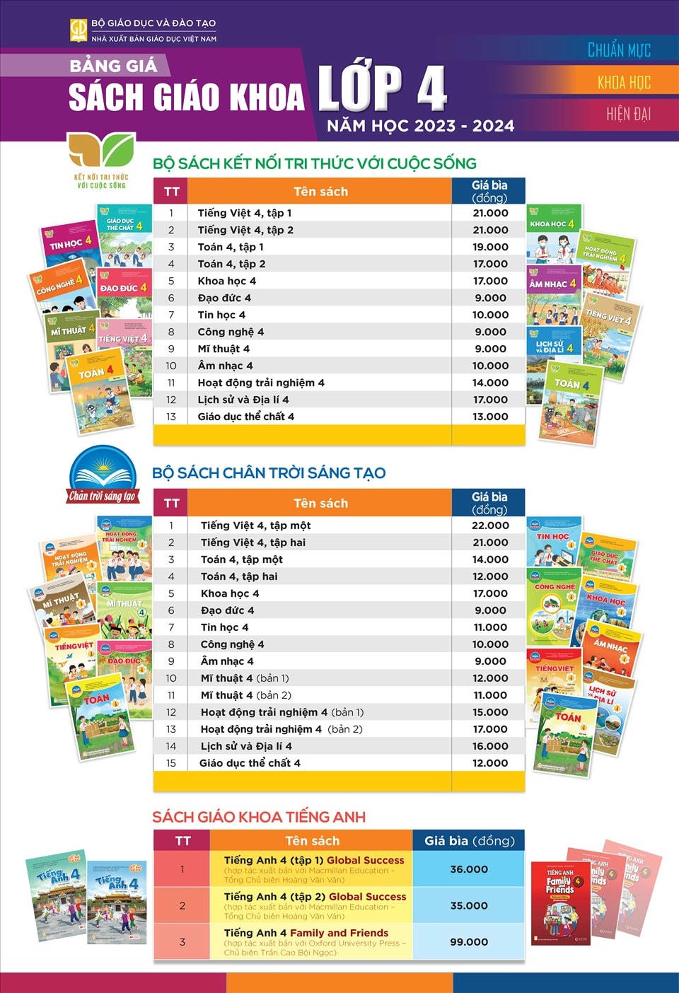 Theo đó, sách giáo khoa lớp 4 bộ Kết nối tri thức với cuộc sống gồm 13 đầu sách, có giá là 186.000 đồng. Bộ Chân trời sáng tạo có giá là 182.000 đồng (gồm 15 đầu sách, chưa bao gồm sách tiếng Anh).