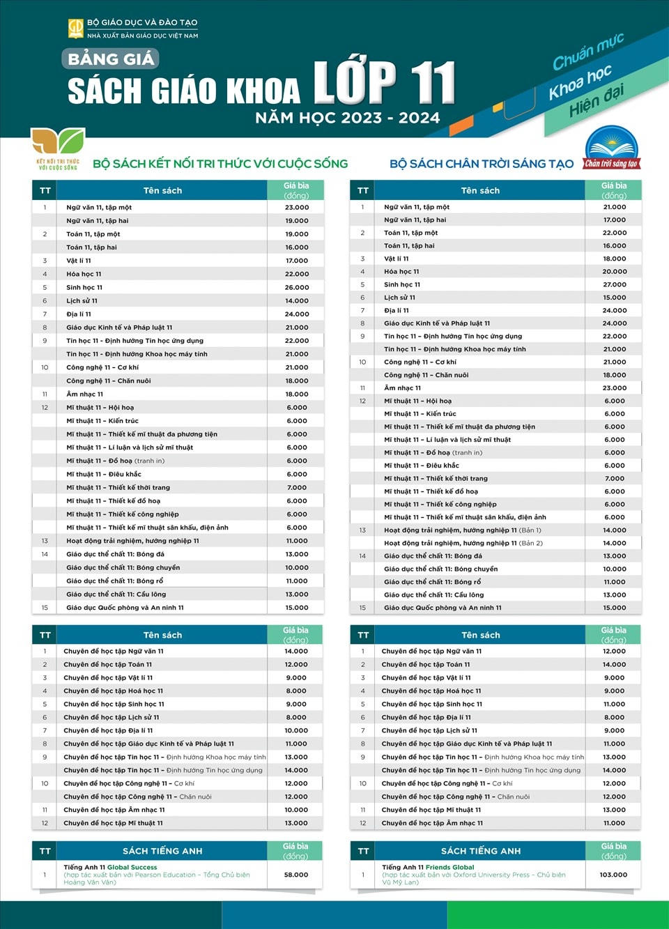 Sách giáo khoa lớp 11 gồm 15 đầu sách tương ứng với các môn học, ngoài ra còn có 12 sách chuyên đề học tập và sách tiếng Anh. Các bộ sách đều có giá trên 400.000 đồng, nhưng học sinh được lựa chọn môn học và các hoạt động giáo dục nên không nhất thiết phải mua cả bộ sách.