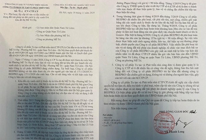 Thời gian từ tháng 4/2019 đến 7/2019 công ty cổ phần BEEPRO đã nhiều lần cắt rào tôn, chiếm giữ mặt bằng của dải cây xanh cách li thuộc dự án KĐT Mễ Trì Hạ. Đặc biệt, tháng 6/2020, Công ty cổ phần BEEPRO đã phá hoàn toàn 137m hàng rào tôn, thiệt hại ước tính 90 triệu đồng.
