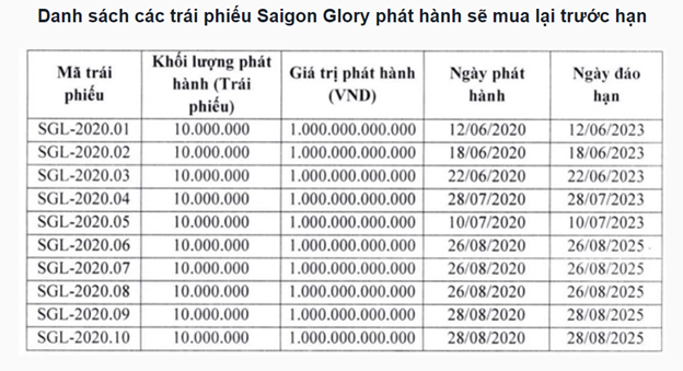 Đối với các gói trái phiếu có mã thứ tự từ SGL-2020.01 đến SGL-2020.05, Saigon Glory cam kết sẽ mua lại trước hạn khi có thể nhưng không muộn hơn ngày 12.6.2023.