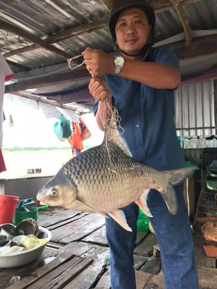 Sau mấy tiếng lênh đênh trên sông Tiền, chúng tôi quay trở lại khu vực bến phà Mỹ Thuận cũ thì may mắn gặp được một ngư dân thả câu ở phía ngã ba sông Lấp Vò bên mạn Đồng Tháp đã bắt được dăm con cá cóc. Cá có phần bụng màu trắng chuyển màu xám dần lên phía lưng với thân hình thuôn tròn, bụng phình ra. Theo ngư dân này, con cá bự nhất nặng hơn 3 kg còn lại đều chưa tới 1 kg. Mớ cá này đã có người thương lái bên Sa Đéc đã đặt mua rồi, tới đầu giờ chiều sẽ xuống lấy. Dù khi gỡ lên cá đã chết nhưng ngư dân vẫn cẩn thận buộc sợi dây cước nhỏ vào lưng cá xách lên chứ không cho vào bịch hay thùng đựng như các loài cá khác. Theo người dân bởi thịt cá cóc thơm và mềm, nếu đặt trong thùng dễ bị nhão nên ngư dân thường phải buộc và treo chúng lên. Vài phút sau, một chiếc ghe nhỏ khác lại cập bến với hơn chục con cá cóc khác được đưa vào.
