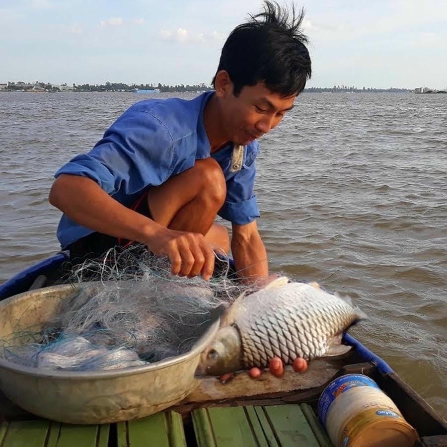 Đi cùng tôi và người ngư dân già ra khu vực thả lưới, thả câu cá cóc còn có anh Nghĩa, 37 tuổi. Anh Nghĩa quê dưới Giồng Trôm (tỉnh Bến Tre) nhưng lấy vợ về đây. Trước vợ chồng anh làm công nhân lột vỏ tôm bên thành phố Mỹ Tho, từ lúc dịch ít đơn hàng nên về nhà vợ ở Cái Bè làm nghề sông nước. Khác với ông Tân săn cá cóc bằng cách thả câu thì anh Nghĩa lại thả lưới. “Thả lưới có ưu điểm là nếu không bắt được cá cóc thì còn có thể bắt được cá lăng, cá sủ, cá mè vinh… Lưới của mình ở độ sâu thấp nên ít cá nhưng may mắn thì có nhiều cá bự không à”, anh Nghĩa cho biết.