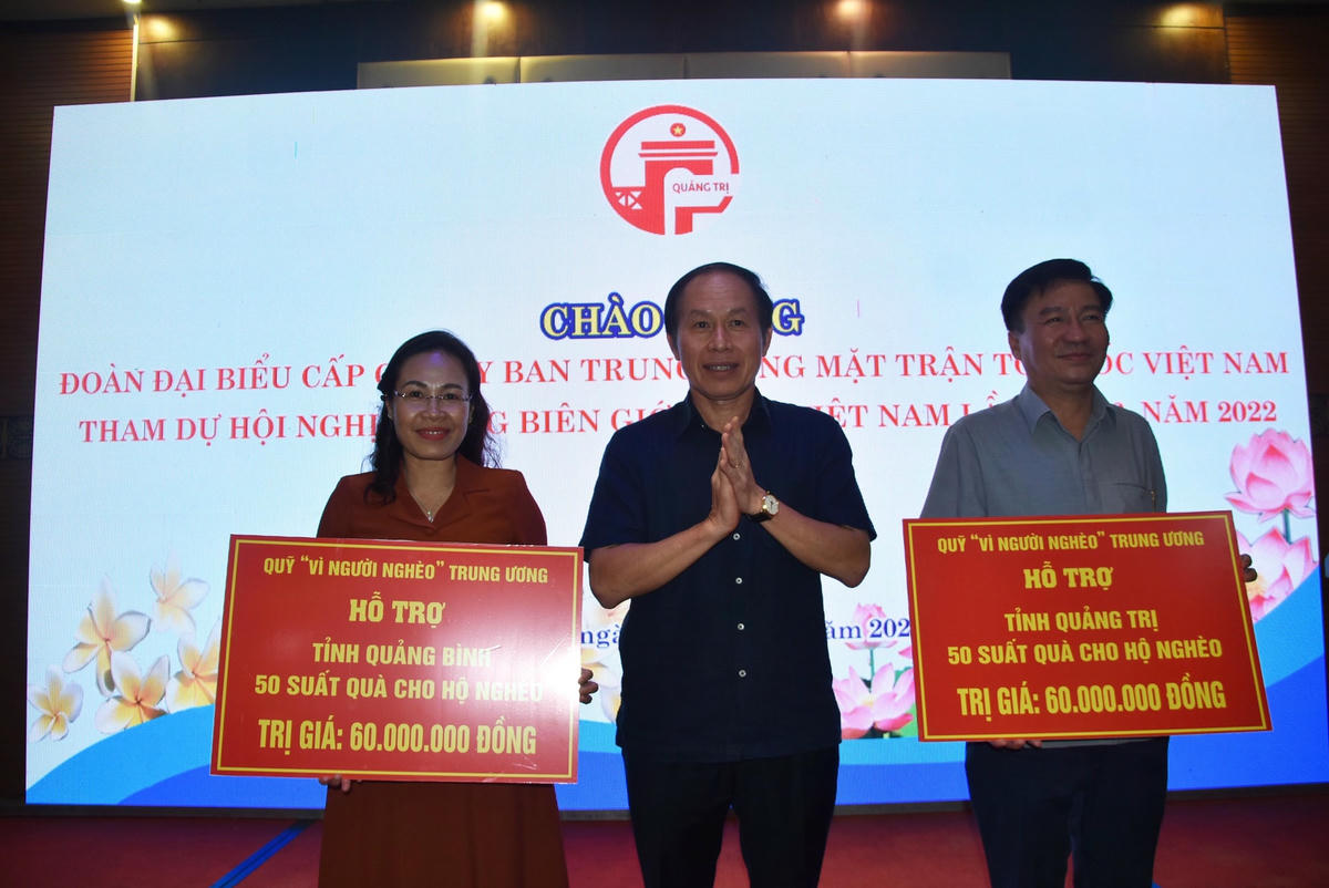 Nhân dịp này, Phó Chủ tịch – Tổng Thư ký Lê Tiến Châu đã trao quà hỗ trợ cho hộ nghèo tại hai tỉnh Quảng Bình, Quảng Trị.