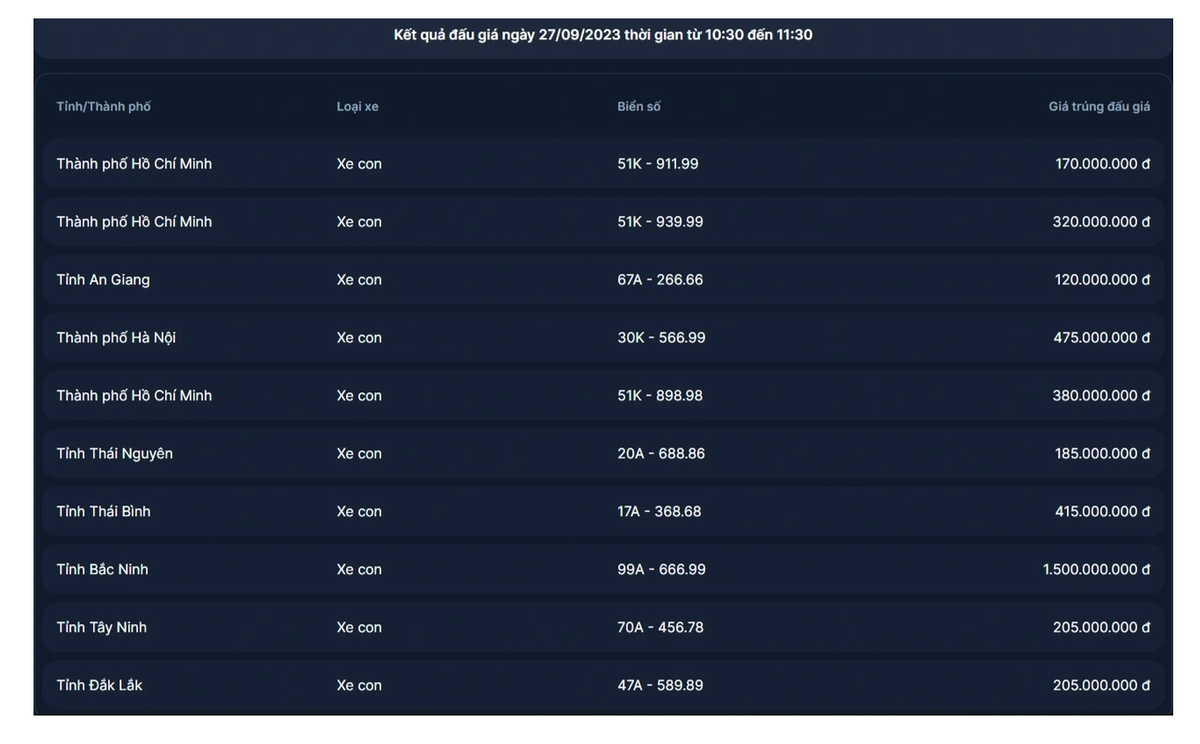 Kết quả đấu giá thời gian từ 10h30 đến 11h30: Biển số 51K-911.99 trúng đấu giá với số tiền 170 triệu đồng. Biển số 51K-939.99 trúng đấu giá với số tiền 320 triệu đồng. Biển số 67A-266.66 trúng đấu giá với số tiền 120 triệu đồng. Biển số 30K-566.99 trúng đấu giá với số tiền 475 triệu đồng. Biển số 51K-898.98 trúng đấu giá với số tiền 380 triệu đồng.