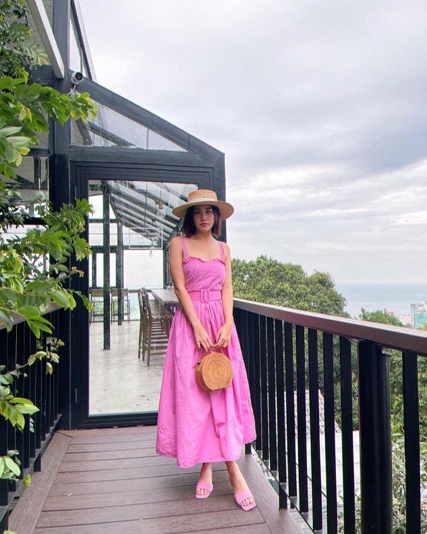 Đầm tím được Văn Mai Hương phối ăn ý cùng sandals tiệp màu, điểm trang mũ vành tròn và túi cói hơi hướng vintage.