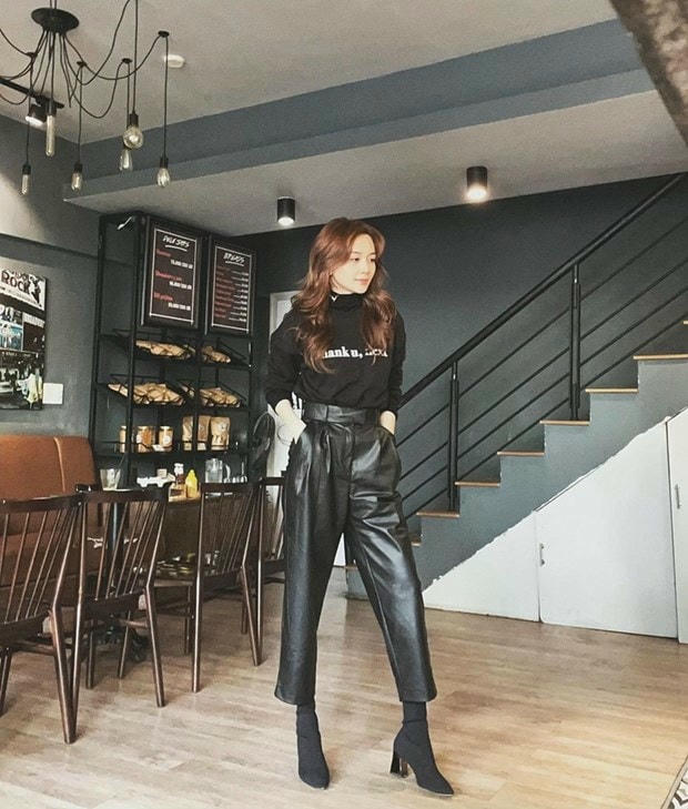 Thiều Bảo Trang dát đồ đen từ đầu tới chân. Quần da cạp cao và áo cổ lọ, kết hợp boots cổ tất, là bộ ba lý tưởng để khai thác lợi thế vóc dáng mảnh mai.