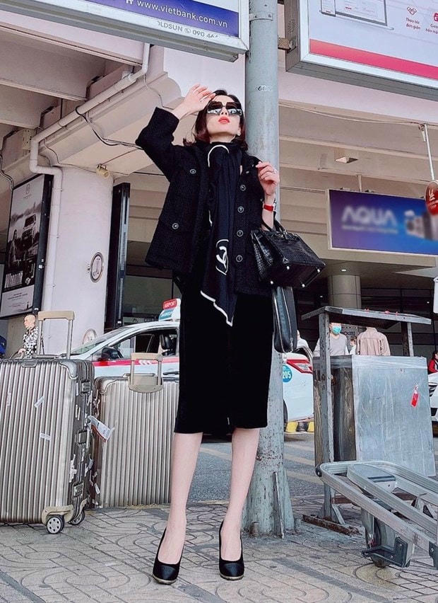 Sắc đen qua cách phối đồ của Lệ Quyên lại tạo nên hình tượng quiý cô sang trọng, đài các. Giọng ca Bolero còn nâng tầm trang phục bằng khăn quàng cổ Chanel và túi Hermès.