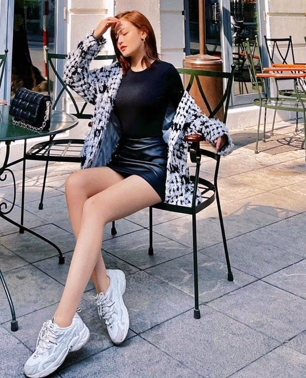 Thùy Anh vừa năng động vừa ngọt ngào khi mix đồ đen bó sát với cardigan len. Cảm hứng tối giản còn được hoàn thiện bằng đôi giày sneakers trắng.