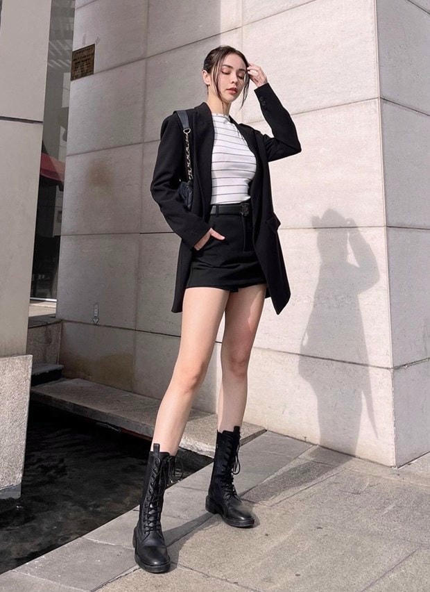 Là tín đồ của combat boots, MLee không quên trưng dụng ''bảo bối'' trong ngày dạo phố đầu năm. Bông hồng lai mix đồ trắng đen theo công thức tối giản. Áo bó sát và quần ngắn, thêm blazer cùng túi kẹp nách, đủ để cô nàng tôn dáng nuột nà lại làm bật phong cách sành điệu.