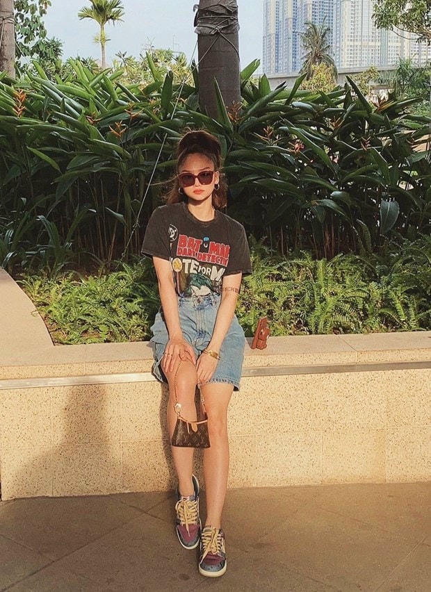 Áo thun và quần shorts denim cạp cao được Miu Lê diện cùng giày thể thao, điểm túi Louis Vuitton xinh xắn. Kết hợp kiểu tóc cá tính, cô nàng đã có màn ''hack tuổi'' thành công.
