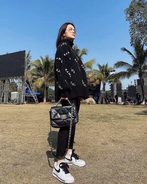 Phạm Quỳnh Anh cũng mix trang phục tuyền đen, ''chấm phá'' bằng đôi giày thể thao trắng của Nike.