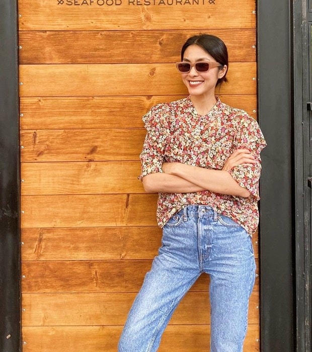 Không phụ kiện cầu kỳ, Tăng Thanh Hà vẫn thể hiện gu thẩm mỹ sành sỏi với quần jeans cạp cao và sơmi hoa nhí. Phép cộng trang phục đơn giản song phát huy được ưu điểm tôn dáng, lại tô đậm vẻ thanh lịch, tràn đầy sức sống của nàng ''ngọc nữ''.