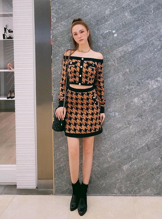 Bắt nhịp xu hướng diện đồ matchy-matchy, Hạnh Sino ưu ái combo chân váy len và crop top, có cùng họa tiết nanh sói. Cô nàng khéo léo kết hợp phụ kiện tông màu tối, càng làm nổi bật được lợi thế vóc dáng, lại tôn được làn da sáng hồng.