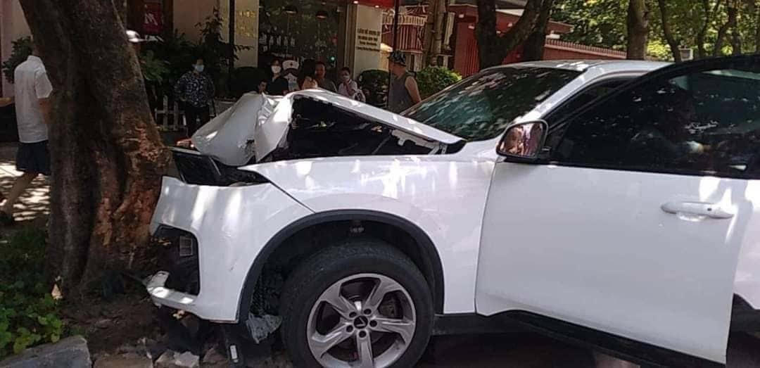 Sau khi va chạm với xe máy, chiếc xe ô tô tiếp tục lao lên vỉa hè và chỉ dừng lại khi đâm vào gốc cây bên đường. Tại hiện trường, 2 túi khí trong xe bung ra.