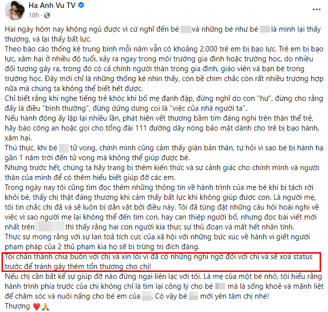 Sau khi tìm hiểu kỹ hơn về sự việc và mẹ đẻ của bé V.A., Hà Anh đã đưa ra lời xin lỗi. Cô gửi lời chia buồn tới mẹ đẻ bé, xin phép xóa bài đăng gây tranh cãi của mình để tránh gây thêm tổn thương đến người phụ nữ này.