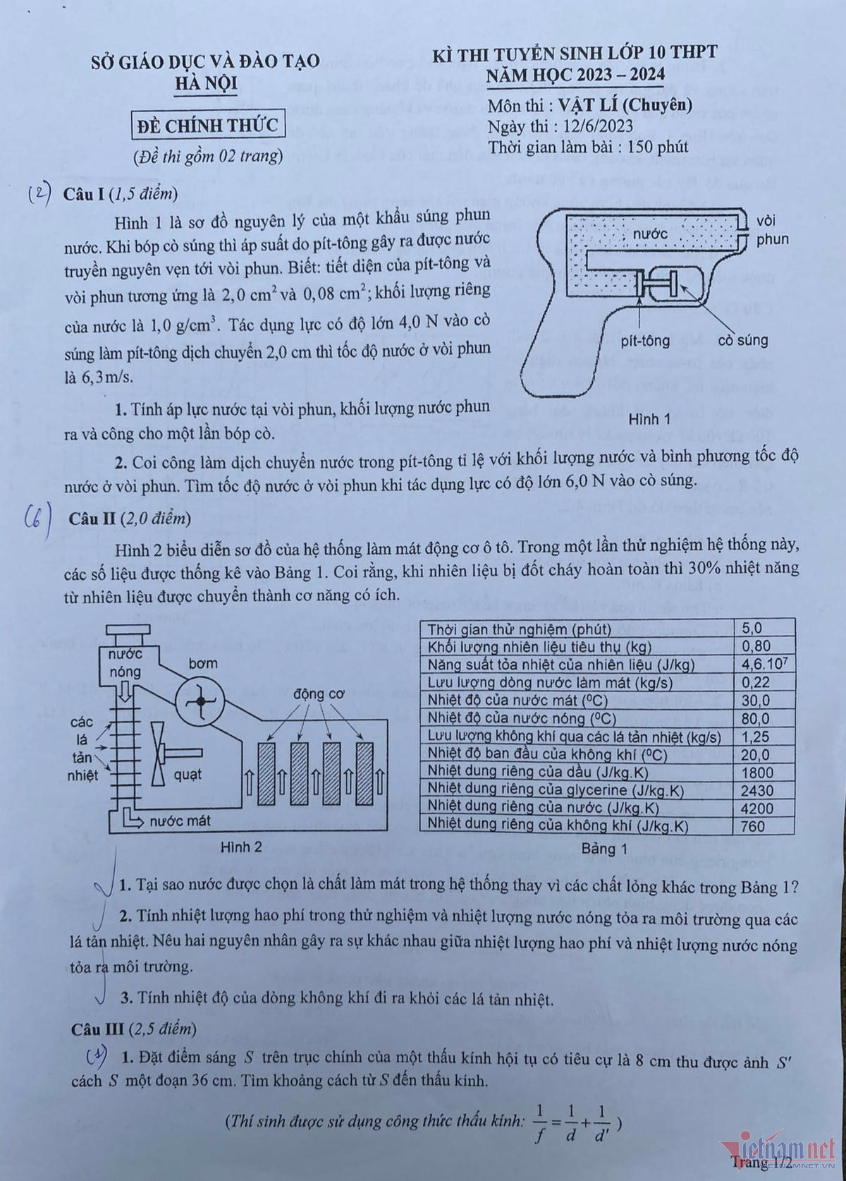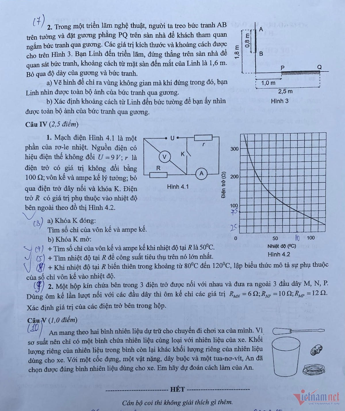 Theo báo cáo của hội đồng ra đề thi, trong đề thi môn Vật lý chuyên, tại câu IV, do sơ xuất trong khâu soạn thảo đã ghi nhầm điểm 3,0 thành 2,5 điểm. Như vậy, thang điểm từng câu của đề thi môn vật lý cụ thể là: Câu I là 1,5 diểm; câu II là 2,0 điểm; câu III là 2,5 điểm; câu IV là 3,0 điểm và câu V là 1,0 điểm. Tổng điểm toàn bài là 10,0 điểm.
