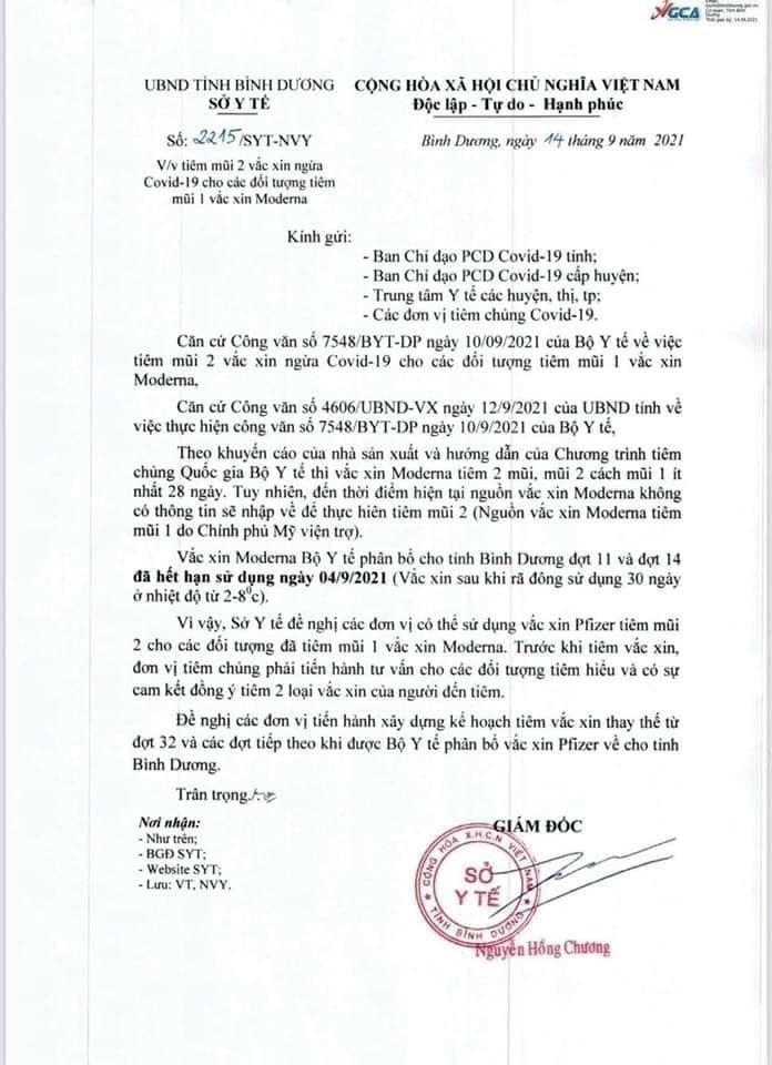 Trước đó, ngày 14/9 trong văn bản của Sở Y tế gửi Ban Chỉ đạo phòng, chống dịch Bình Dương, các đơn vị tiêm chủng đề xuất tiêm mũi 2 vaccine ngừa Covid-19 cho người đã tiêm mũi 1 bằng vaccine Moderna có đoạn "Vaccine Moderna do Bộ Y tế phân bổ cho Bình Dương đợt 11 và 14 đã hết hạn sử dụng ngày 4/9/2021 (vaccine sau khi rã đông sử dụng 30 ngày ở nhiệt độ từ 2-8 độ C). Vì vậy, Sở Y tế đề nghị các đơn vị có thể sử dụng vaccine Pfizer tiêm mũi 2 đã tiêm mũi 1 vaccine Moderna".