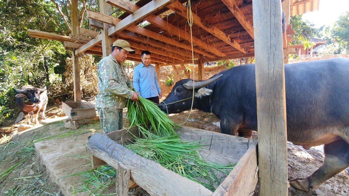Theo anh Thinh, đàn trâu, bò nhà anh chủ yếu chăn thả trên bãi cỏ chung của bản. Bên cạnh đó, gia đình còn đầu tư xây dựng chuồng nuôi nhốt từ 3-5 con trâu, bò và trồng hơn 1.200 m² cỏ voi để chủ động nguồn thức ăn. Đặc biệt, thường xuyên phối hợp với cán bộ thú y, khuyến nông của xã để tiêm vaccine phòng bệnh định kỳ nên đàn gia súc phát triển rất tốt, ít bị bệnh và xuất chuồng nhanh hơn.