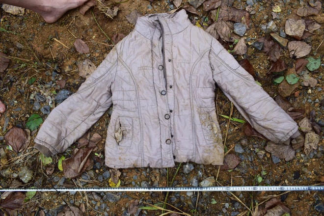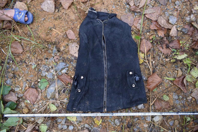 Nạn nhân mặc ngoài áo khoác màu trắng xám, trong mặc áo nỉ màu đen cộc tay, có khóa kéo; trong cùng mặc áo phông dài tay màu xanh than; cổ quấn khăn len màu trắng đen; quanh bụng buộc một túi thổ cẩm kích thước 19 x 12cm; mặc quần nỉ màu đen, bên trong mặc quần chun màu huyết dụ.