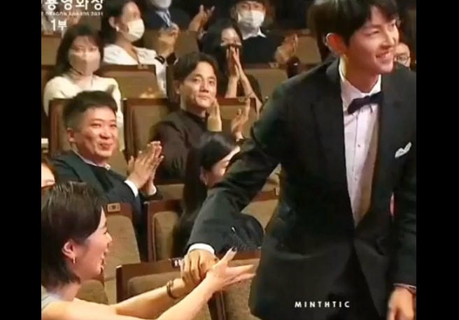 Theo hình ảnh video được lan truyền trên Twitter, Song Joong Ki nhận giải "Ngôi sao nổi tiếng". Lúc MC xướng tên, Jeon Yeo Bin ngồi cạnh reo hò. Tài tử trước khi bước lên sân khấu đã nhìn sang, nắm tay cô. Tiếp đó, Jeon Yeo Bin cũng được xướng tên ở hạng mục này.