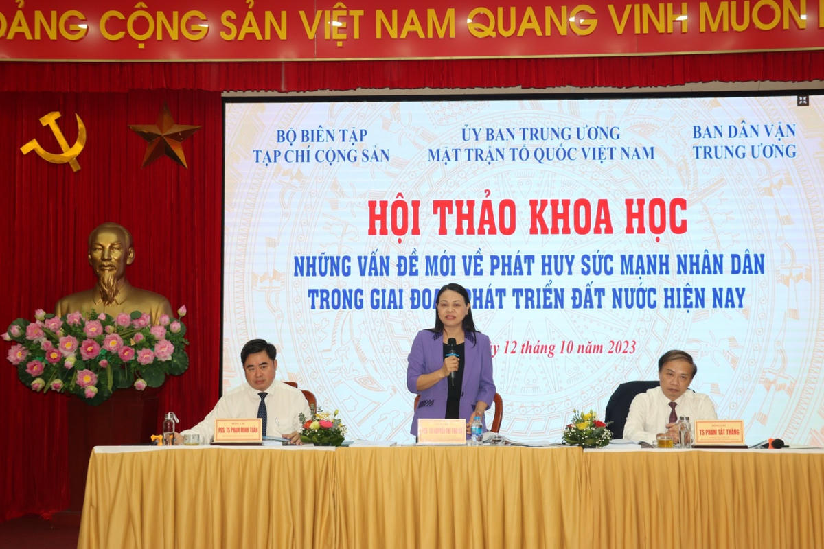 Phát biểu tại hội thảo, Phó Chủ tịch – Tổng Thư ký Nguyễn Thị Thu Hà nhấn mạnh, phát huy sức mạnh nhân dân là quan điểm xuyên suốt nhất quán, ngày càng thể hiện sâu sắc trong yêu cầu, tình hình mới hiện nay. Phát huy sức mạnh của nhân dân được thể hiện ở những việc thực hiện đồng bộ các giải pháp để định hướng khơi dậy và phát huy giá trị tích cực như: Lòng yêu nước, tính tự tôn dân tộc, khát vọng độc lập tự do... Tất cả những mục đích đó nhằm xây dựng phát triển đất nước, chăm lo đời sống tốt hơn cho nhân dân.