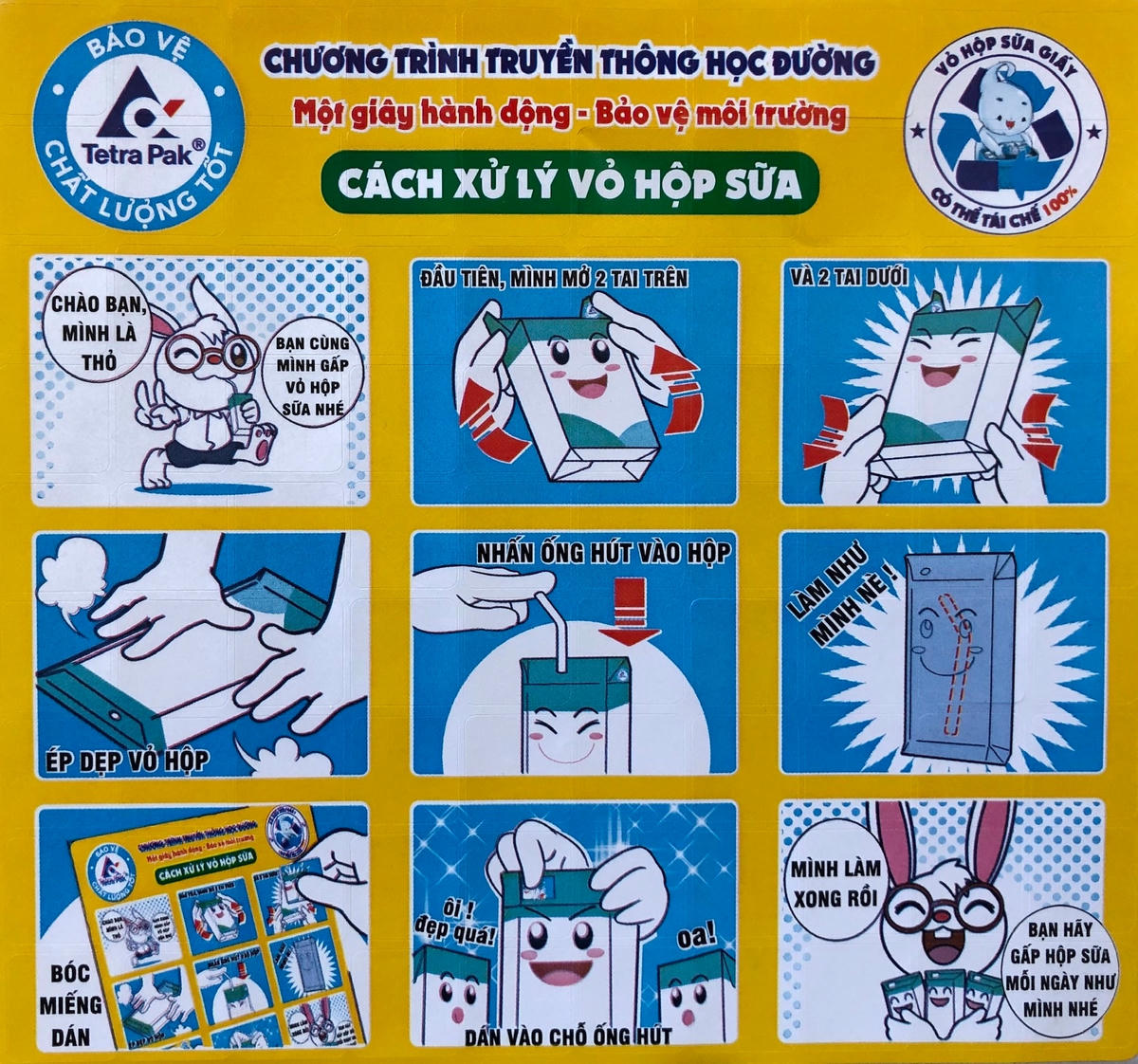 Chương trình tái chế học đường năm nay sẽ tiếp tục hướng dẫn các em học sinh cách xử lý vỏ hộp sữa sau khi uống như cho ống hút vào trong hộp, làm dẹp, dán kín miệng hộp và bỏ vào đúng nơi quy định.