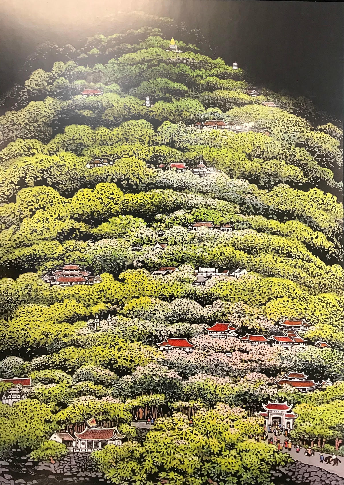 Để từ năm 1959, khi có dịp xuống công tác với vai trò chủ chốt gây dựng phong trào mỹ thuật ở vùng mỏ Quảng Ninh, thì cảnh quan hùng vĩ của vịnh biển và những núi những đảo, vẻ tráng lệ, huyền ảo của trời nước vào những thời điểm trong ngày đã trở nên ấn tượng đặc biệt về vùng đất lớn lao đầy mời gọi. Những bức tranh khổ lớn của ông trong triển lãm được ông vẽ lâu, vẽ kỹ, hướng đến tinh thần khái quát và tính biểu tượng đã toát lên tình yêu lớn đó. Như “Hạ Long nghìn đảo” (sơn mài, 154x300cm), ông vẽ năm 2020 ở tuổi 90, “Đêm Tuần Châu”, cùng chất liệu và kích thước, vẽ năm 2017, và bức sơn mài “Lán bè Hạ Long” vẽ năm 2014, 154x300cm mà họa sĩ tâm đắc nhất…