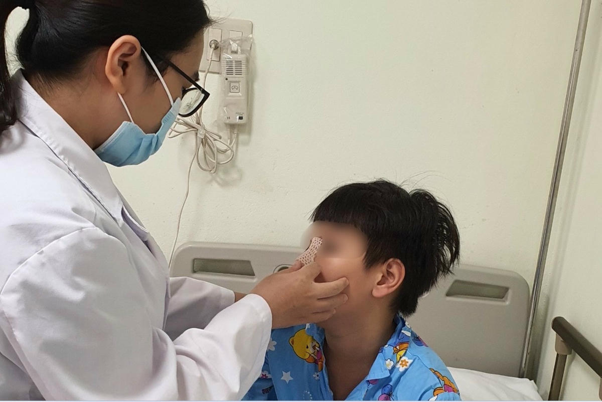 Theo BS Lê Thị Nga – Khoa Phẫu thuật tạo hình thẩm mỹ và hàm mặt, bệnh nhi nhập viện do tai nạn sinh hoạt nghiêm trọng, trong tình trạng mặt sưng nề, bầm tím nhiều vùng mũi, biến dạng lõm vùng mũi phải. Mũi không chảy máu do được sơ cứu trước đó. Kết quả chụp CT hàm mặt, xác định có tổn thương gãy xương chính mũi phải. Bệnh nhi được chuyển sang Khoa Phẫu thuật tạo hình thẩm mỹ và hàm mặt và được các bác sĩ tiến hành phẫu thuật nắn chỉnh mũi.