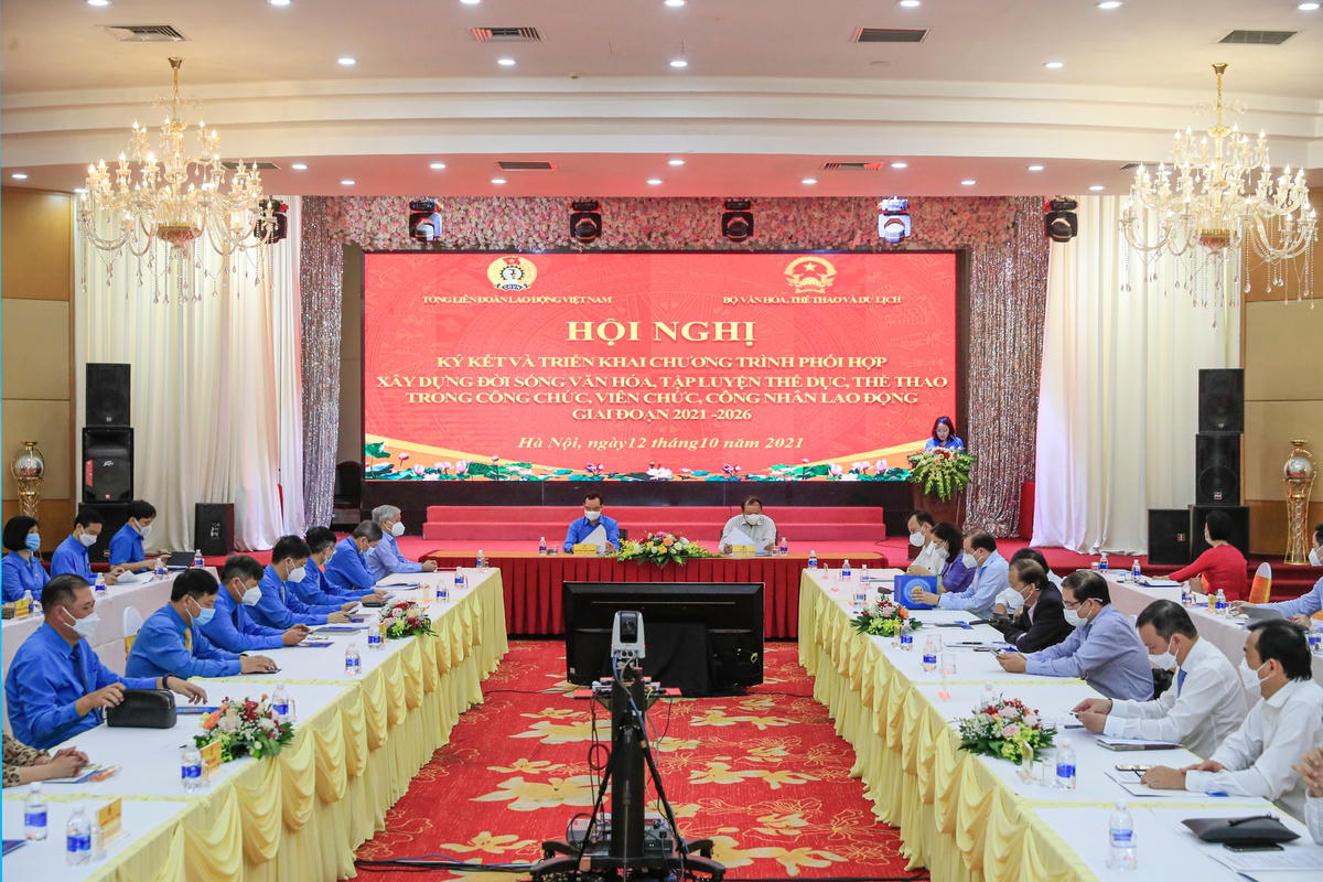 * Tại Hội nghị Bộ VHTTDL và Tổng LĐLĐ Việt Nam đã ký kết Chương trình phối hợp về xây dựng đời sống văn hóa, nâng cao hiệu quả hoạt động thể dục, thể thao của CC, VC, CNLĐ trong các cơ quan, đơn vị, doanh nghiệp giai đoạn 2021-2026. Theo đó, hai bên sẽ tập trung vào 6 nội dung phối hợp cụ thể như: phối hợp tổ chức tốt các hoạt động văn hóa, văn nghệ, thể dục thể thao; khuyến khích thói quen đọc sách, rèn luyện thể dục thể thao nâng cao sức khỏe, phòng, chống bệnh nghề nghiệp; nhân rộng các mô hình điểm về văn hóa, thể thao và gia đình trong công chức, viên chức, công nhân lao động; phát huy các nguồn lực xã hội để đầu tư phát triển các thiết chế văn hóa…
