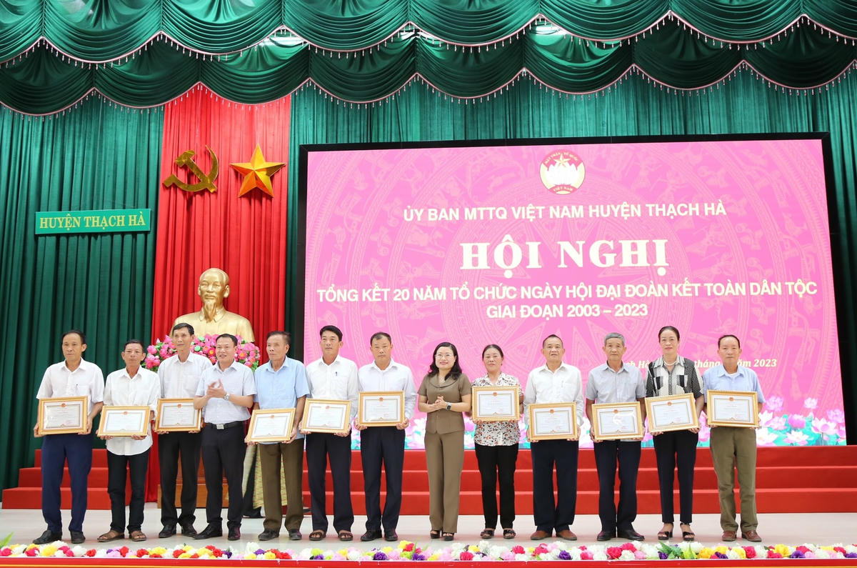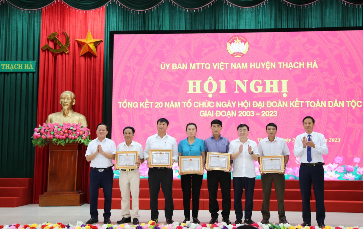 Tại hội nghị, UBND huyện, Ủy ban MTTQ huyện Thạch Hà đã tặng giấy khen cho 22 tập thể và 10 cá nhân có thành tích xuất sắc trong các phong trào thi đua yêu nước, tổ chức Ngày hội Đại đoàn kết toàn dân tộc.