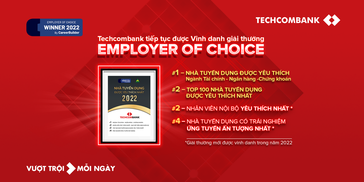 Trong nhiều năm liền, Techcombank luôn là ngân hàng dẫn đầu trong các bảng đánh giá xếp hạng về nơi làm việc tốt nhất Việt Nam. Bên cạnh giải thưởng mà Career Builder ghi nhận, Techcombank còn được HR Asia Awards ghi nhận là “Nơi làm việc tốt nhất Châu Á” trong 3 năm liên tiếp (2020- 2022), và là ngân hàng Việt Nam đầu tiên được công nhận là “Nơi làm việc xuất sắc” do tổ chức quốc tế uy tín Great Place to Work bình chọn năm 2022.